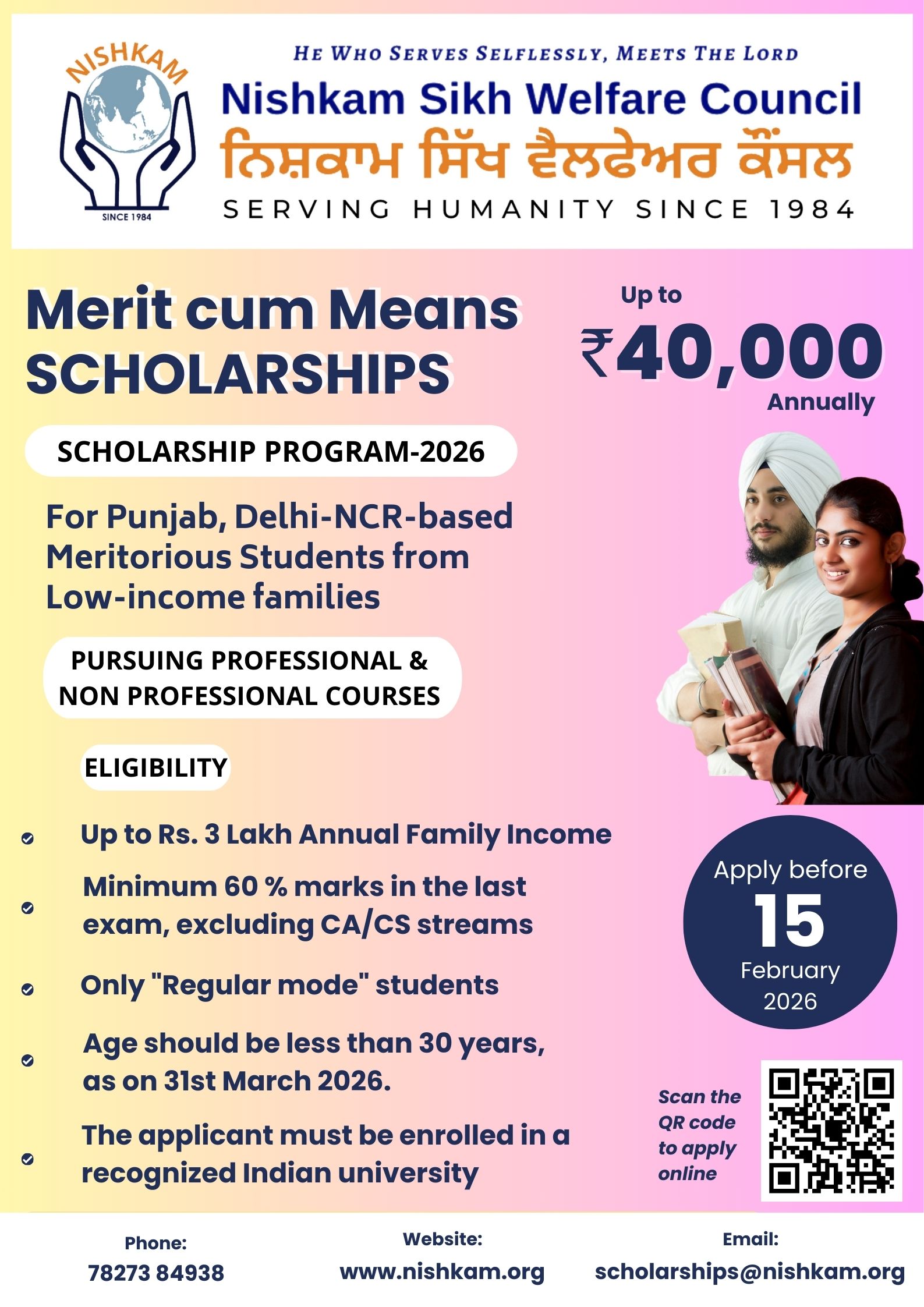 Scholarship Update Advertisement for Nishkam MCM Scholarship – 2025 Instructions/ Guidelines/ Eligibility Criteria of Nishkam MCM Scholarship Nishkam Merit-Cum-Means (MCM) Scholarship - 2025 - 2026 PDF Version of “Naitik Sikhiya” sponsorship Pledge Form-for Indian Donors Pledge Form-for Canadian Donors Pledge Form-for USA Donors